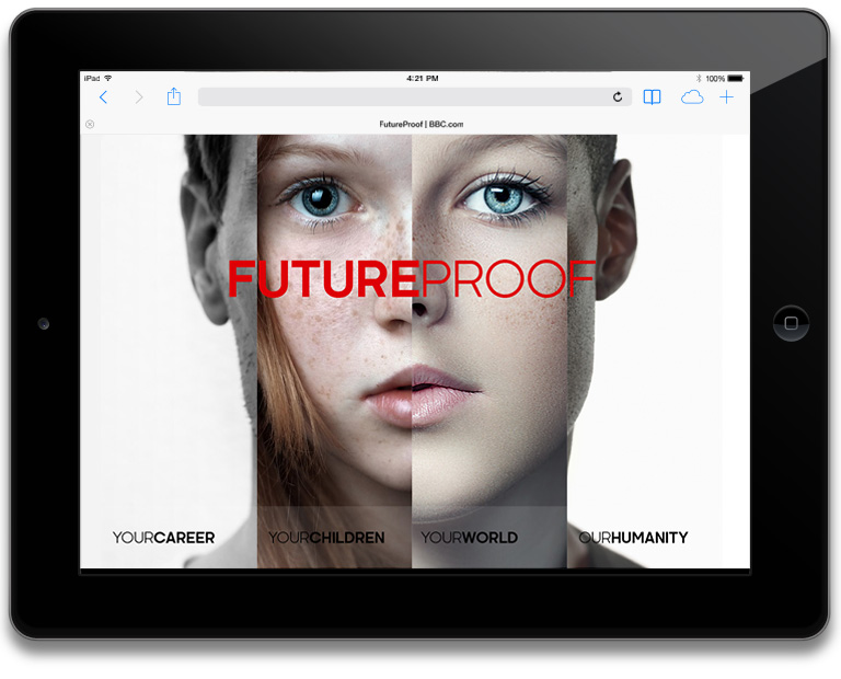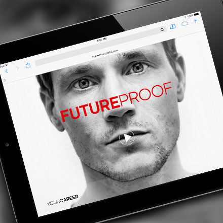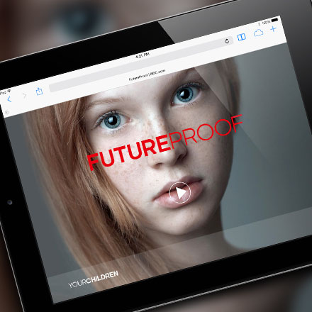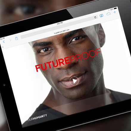 The concept here was to create a destination site that would facilitate a conversation to equip the society of tomorrow with the knowledge to make the best choices today. FutureProof will explore the impact that automation and robotics will have on the very elements that underpin society, empowering the audience with the knowledge to make the best choices, for themselves, for their families, for their society. By integrating Facial Recognition Technologies within the platform, information and content would be presented to the end user based on their specific emotional response. From careers, to families to human kind, FutureProof will explore how automation will shape our world as we start to step into the fourth industrial revolution. Full screen imagery of this digital interactive page contains combined faces to illustrate the the four main topics of focus for our 'FutureProofing' concept. Using video, each of the four facial components will come alive, inviting the user to discover more in each specific topic area; Your career, Your children, Your world, Our Humanity.