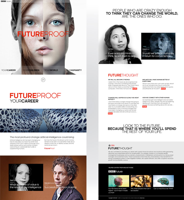 The site offers two paths depending on the chosen level of user interaction: A full interactive experience: with the use of facial recognition technology, where the user will be presented with relevant information and content, specific to their emotional reaction to the video. The content will display at the end of the video based on the user's overall emotional response. For example, worry, anger, intrigue etc. OR The ability to watch the video and further engage with content by scrolling to discover more. All videos will contain a set of thought-provoking statements linked to 'Life Questions' ("In the future, will my children have to compete with robots?"), specific to each of the four topics (Your career, Your children, Your world, Our Humanity).FutureProof Your Career