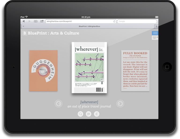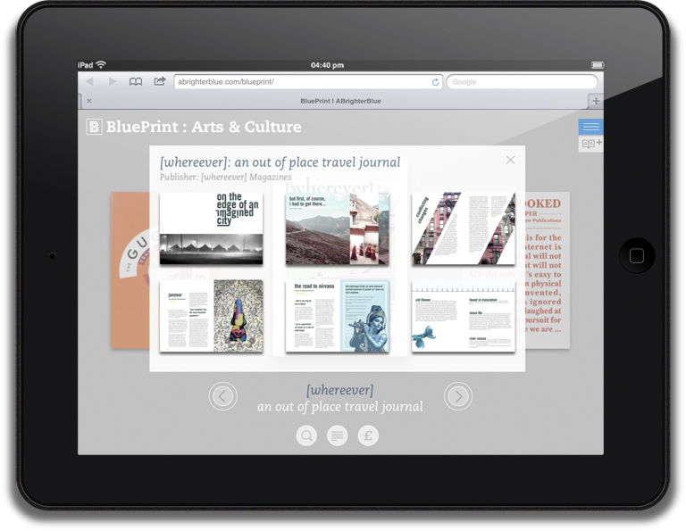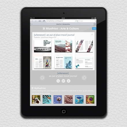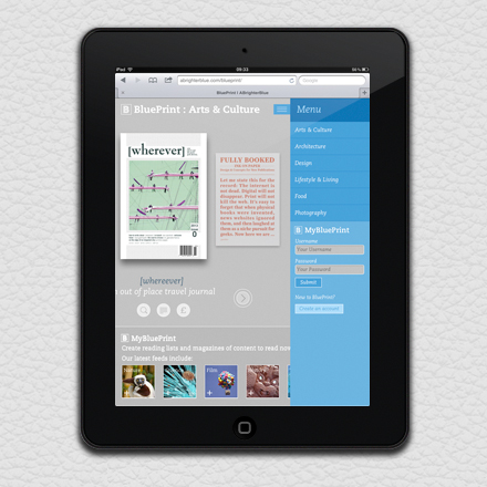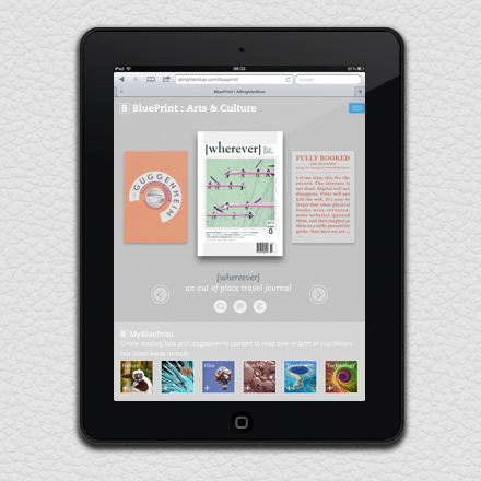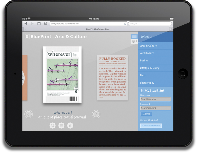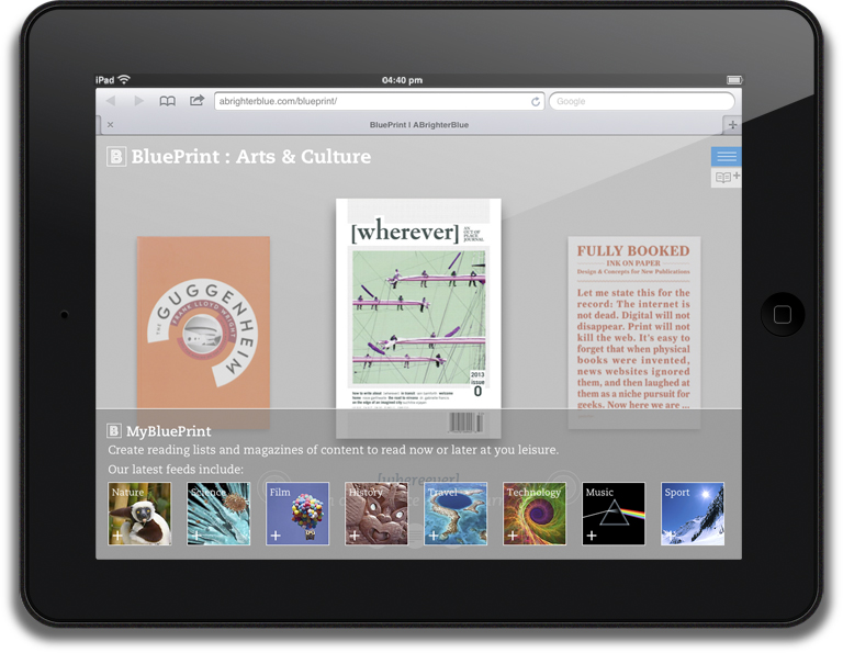 BluePrint is a personal Proof of Concept Web App. Utilising RSS feeds and HTML5, users would be able to view, store and personalise curated content. It's a reading suggestion tool that lets you try before you buy allowing you to read extracts and view page spreads. BluePrint could facilitate the reading of paid for digital magazine content, allowing users to login and access their favourite Newsstand titles. With endless permutations, BluePrint would be many things to many people.
