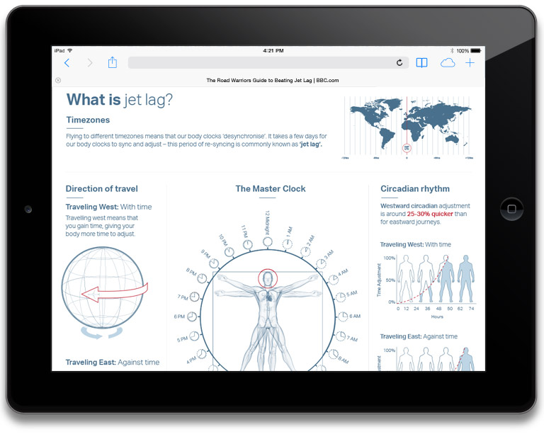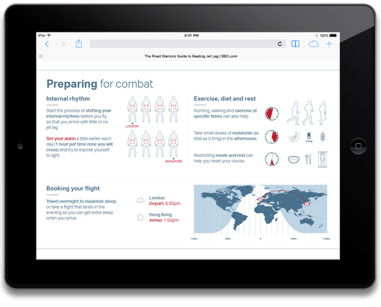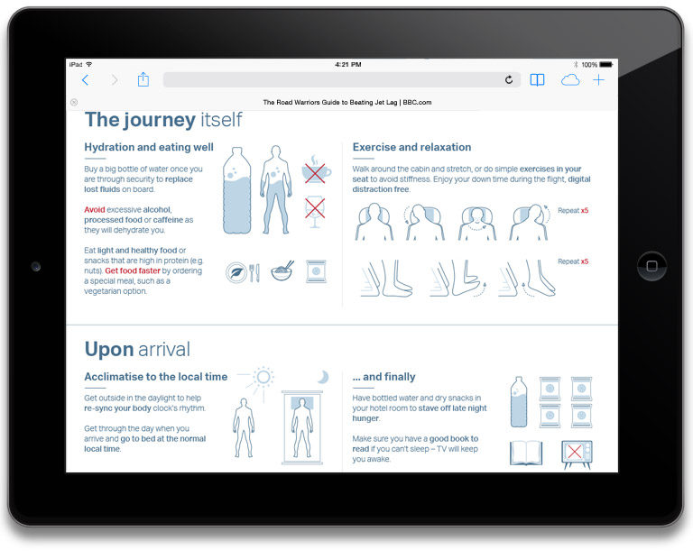 Travelling around the world is exciting but it can sometimes be tiring as well. This infographic formed part of a guide of top tips to show you how to stay fresh and healthy on the go so that you can travel well on every journey. The Road Warriors Guide to Beating Jet Lag infographic was produced under extremely tight guidelines paired with short deadlines. Liaising with BBC colleagues and corporate stakeholders in Asia, I both managed to achieve what the client was looking but also bring this segment of the project in on time. View The Road Warriors Guide to Beating Jet Lag here.